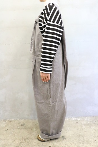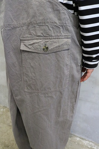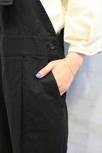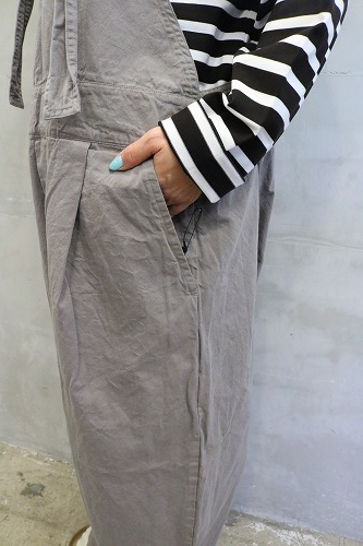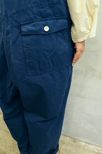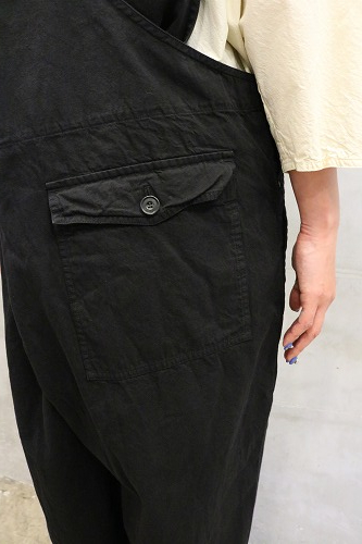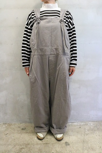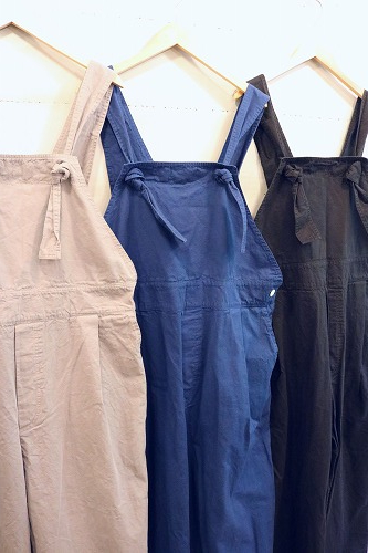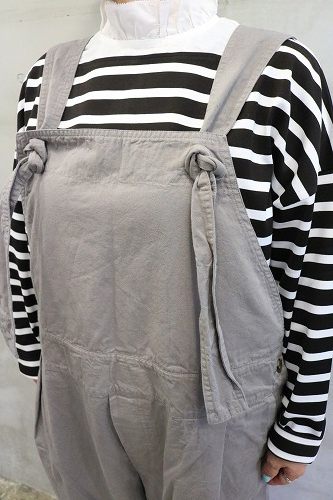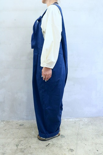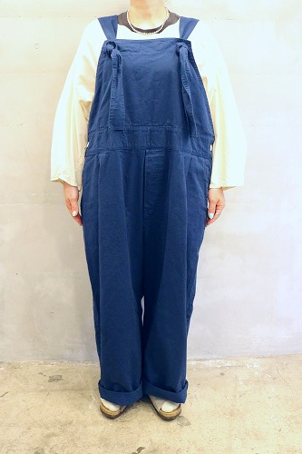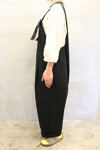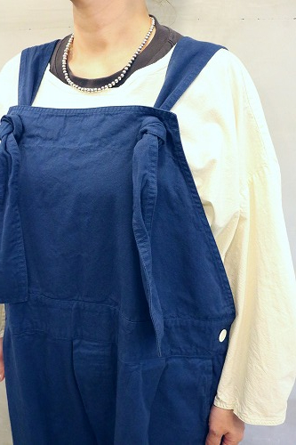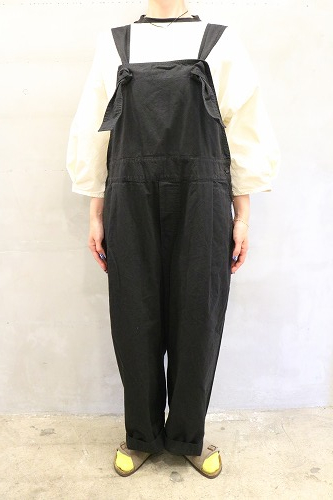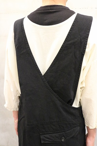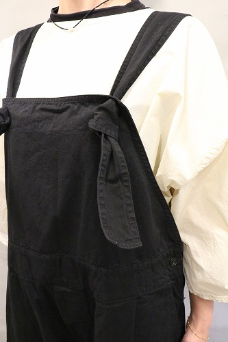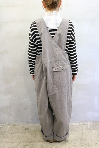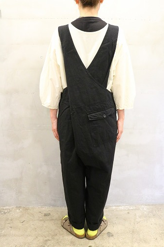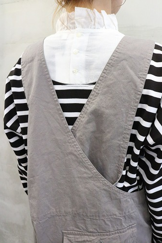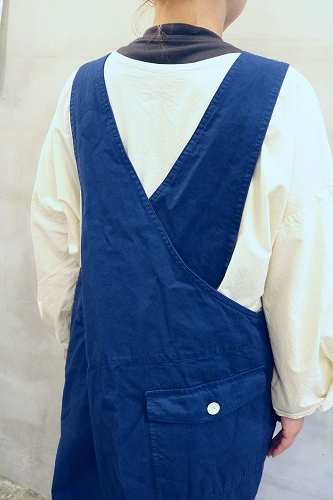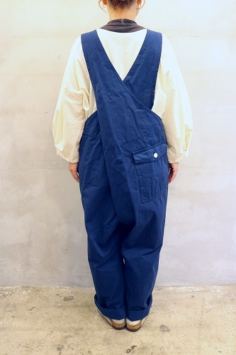 肩紐を後ろで交差させて着用するデザインが特徴的なオーバーオール。