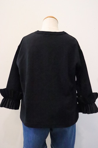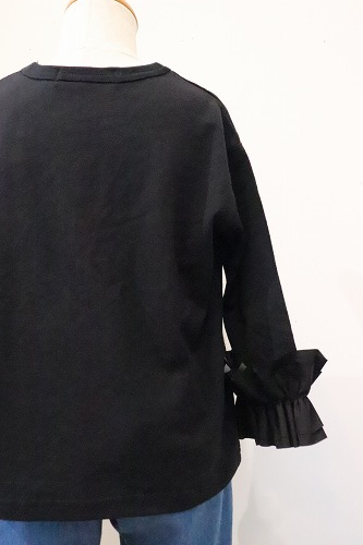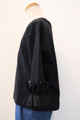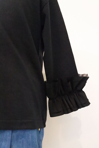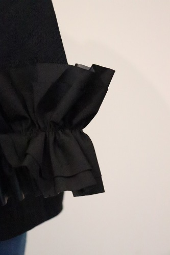 すっきりとしたTシャツをベースにして、袖に別素材のフリルが付いてます。
