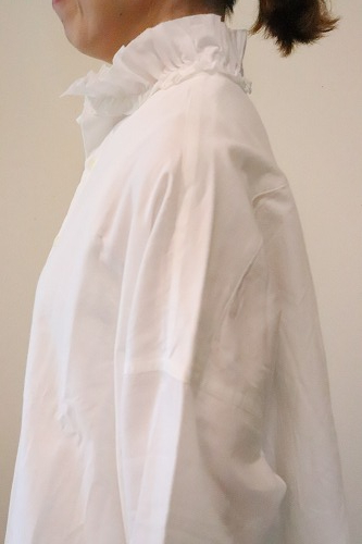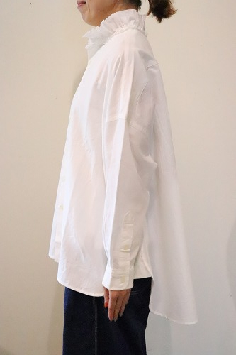 首元が華やかなフリルシャツ。