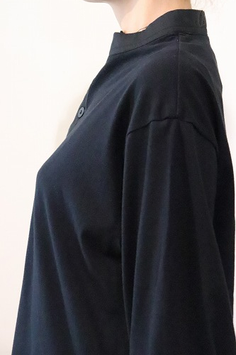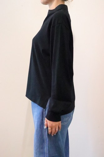 身頃はカットソー、衿ぐりと前立ては布帛使いのシュリンクプルオーバー。