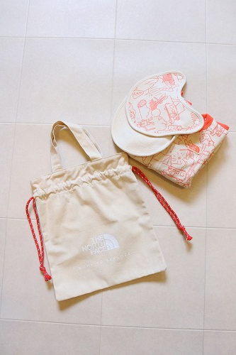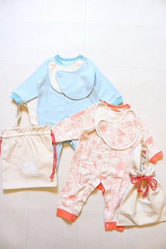 肌触りの良い長袖ロンパースとスタイ2点と巾着のセット。