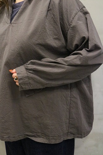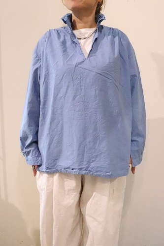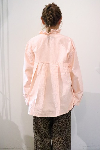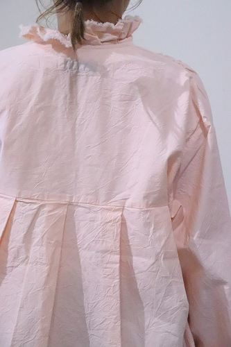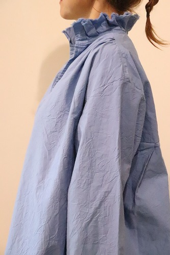 タックフリルを寄せたスタンドカラーが特徴的なブラウス。