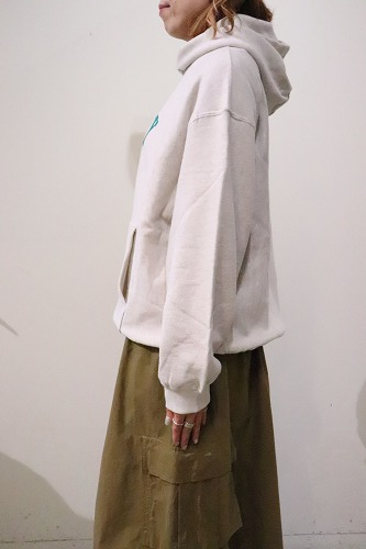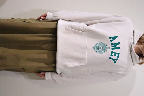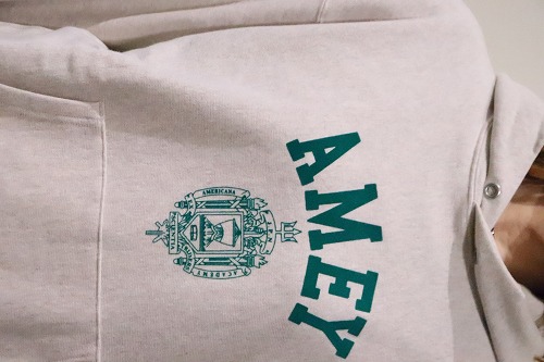 クラシカルなカレッジ調の「AMEY」プリントが施されたスウェットフーディ。